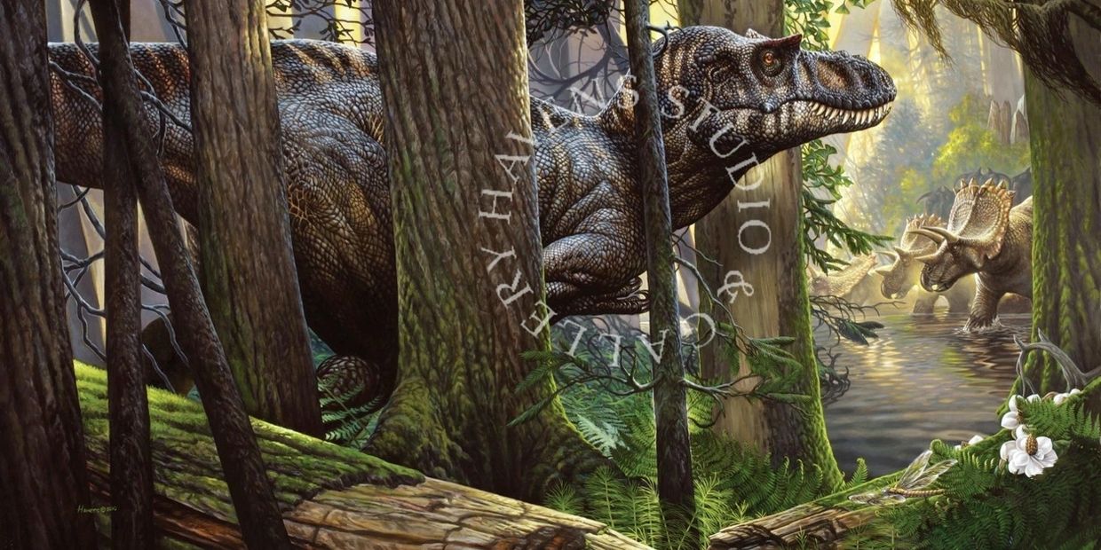 The sun gently rises as a herd of Anchiceratops cautiously cross a river - on their annual migration to the birthing grounds farther north. A stealthy Albertosaurus silently stalks the opposite shore in anticipation of the ambush to come in what is now Alaska 70 million years ago.