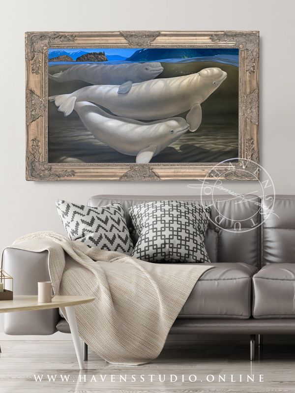 The painting portrays a family group of Cook Inlet Beluga Whales (the juvenile is gray in color) at high tide in the silty waters pursuing the silver salmon silver salmon on there way to the glacial streams of the Chugach National Forest.
