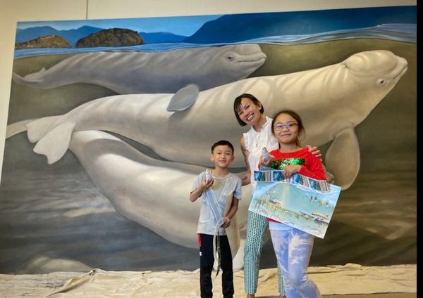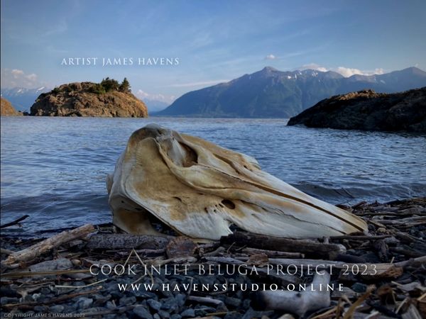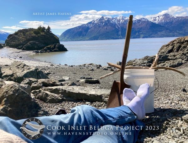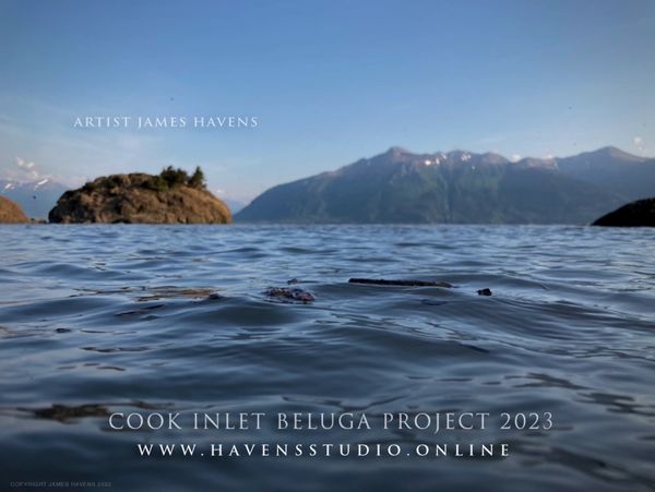 THE COOK INLET BELUGA PROJECT 2023 features Alaska’s critically endangered Beluga Whales of Cook Inlet Alaska. The location featured within the painting is the important archeological Beluga point site located on Cook Inlet’s Turnagain Arm, Alaska.